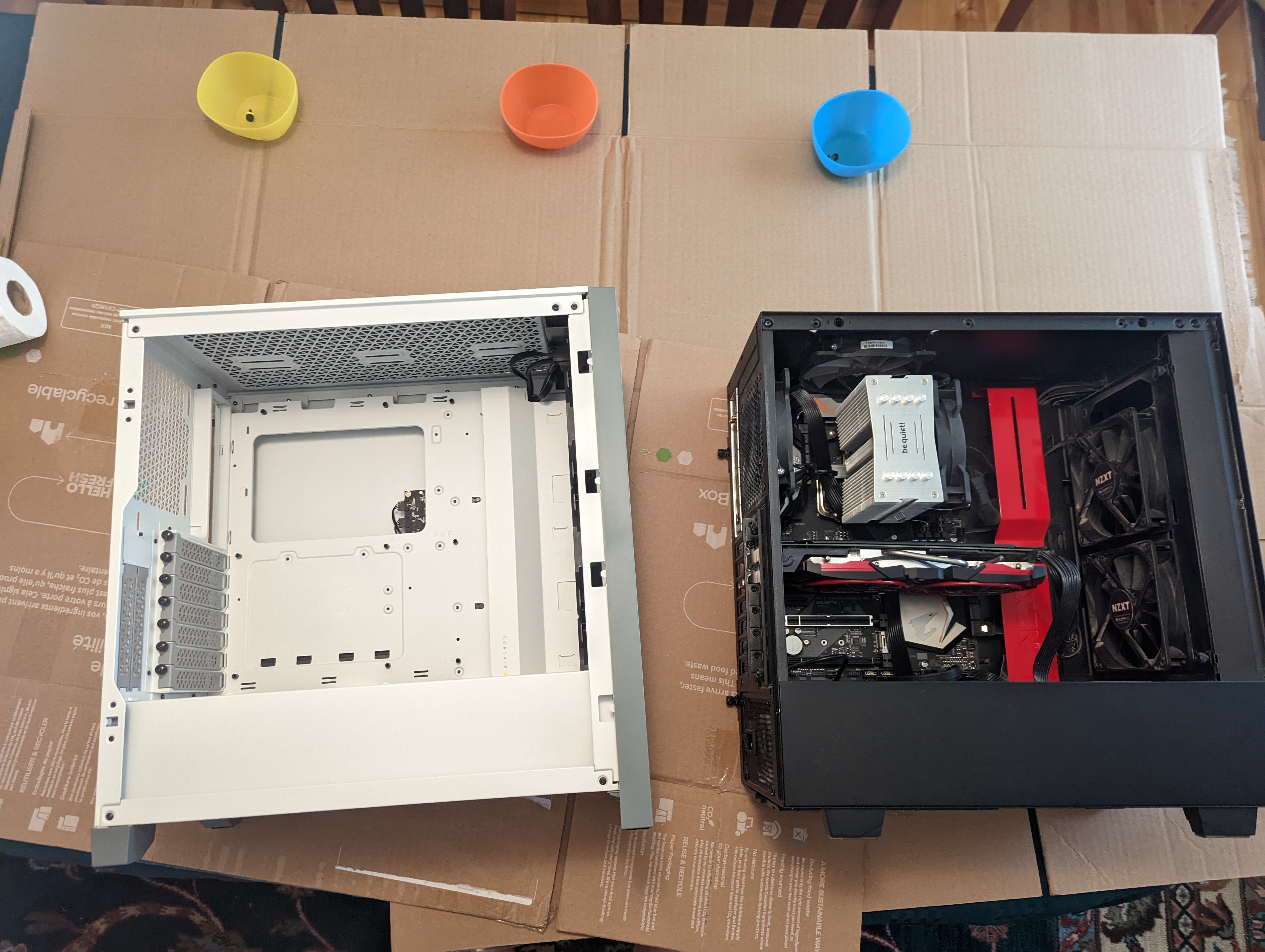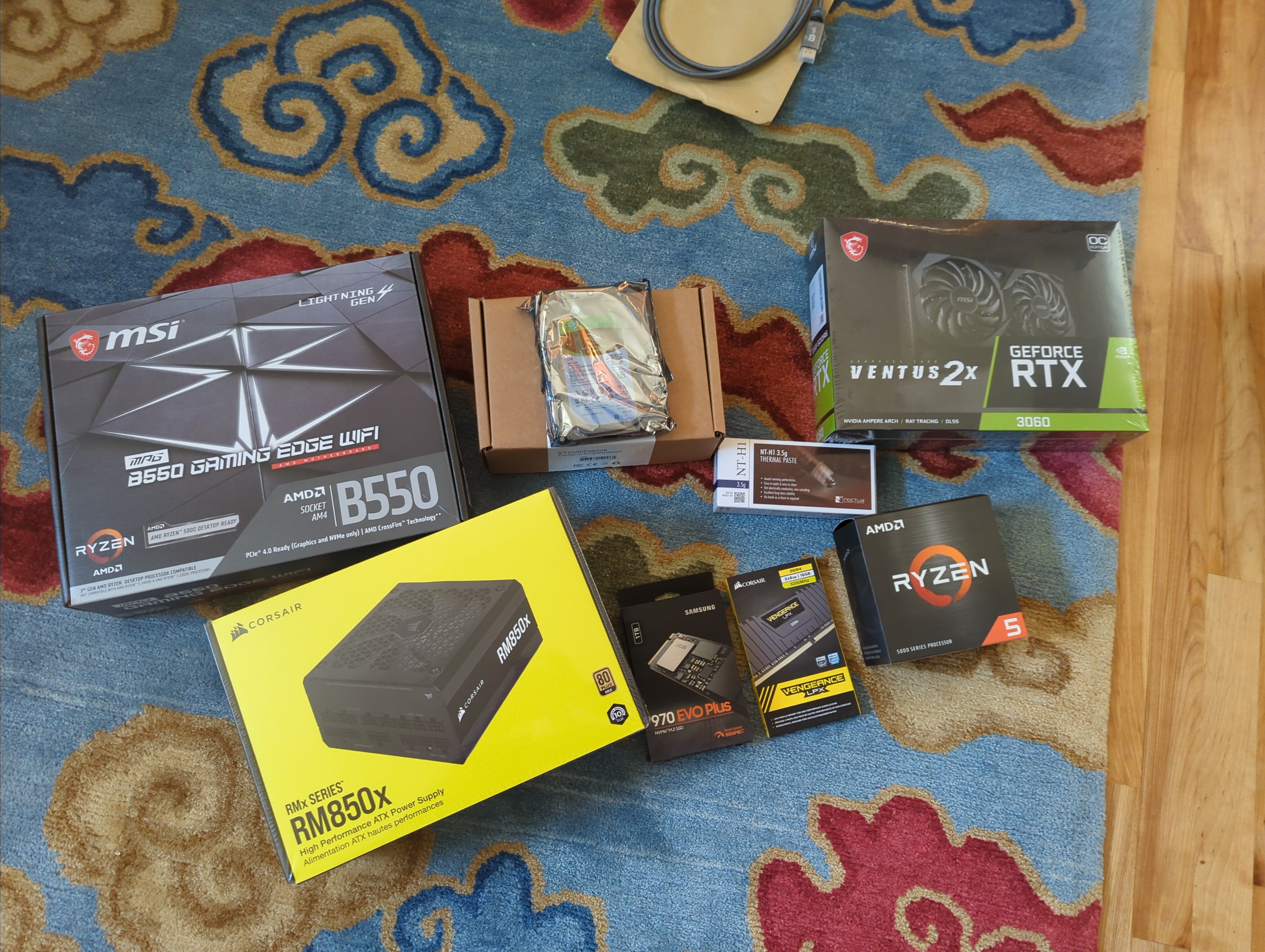 A photo of some of the parts in my new build, as well a a hard drive for the third computer.