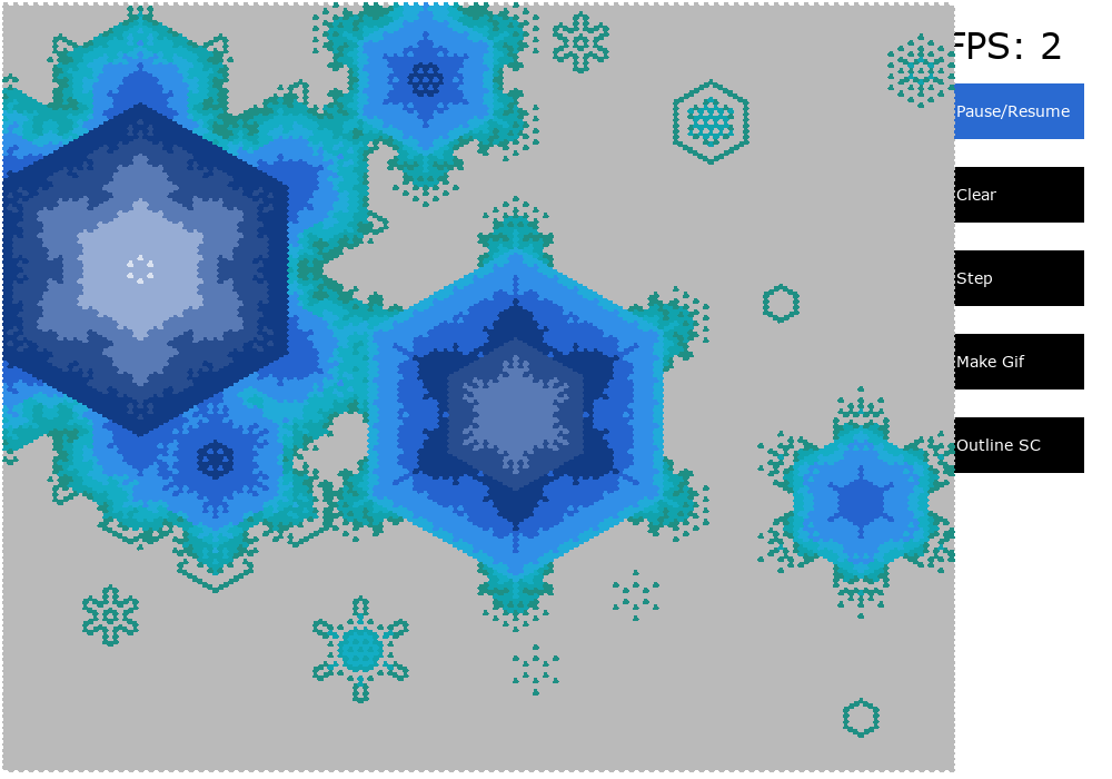 Snowfake (also sometimes known as Game of Hex) is a hexagonal Game of Life like cellular automaton.