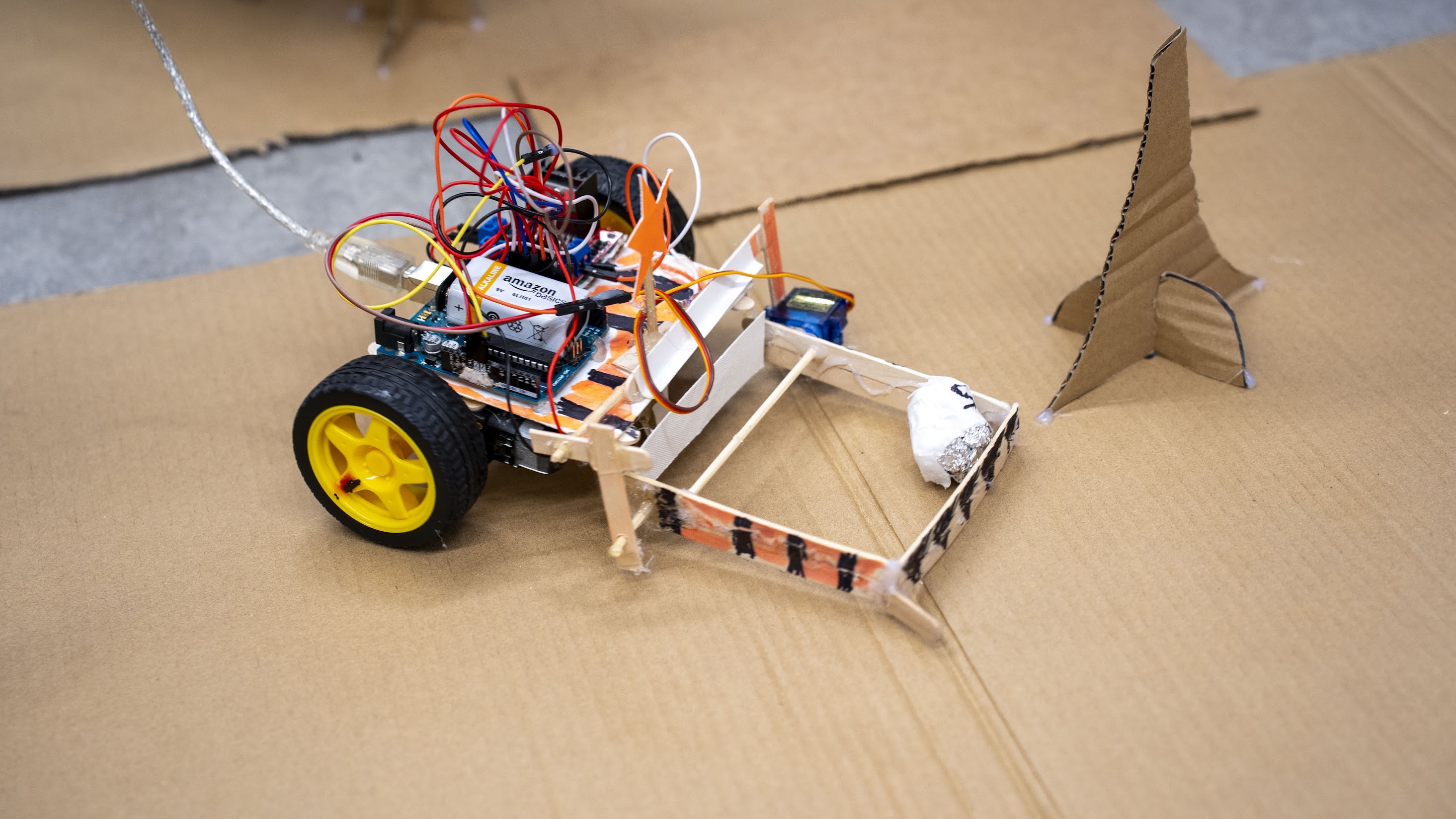 We drafted up many designs at the start, but settled on a Wall-E like robot with a pivoting arm. Everything was built from scratch with popsicle sticks, paper plates and a lot of hot glue. The robot had two DC motors on it to drive, and was controlled using a laptop's keyboard and a serial connection over USB.